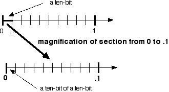 For decimal tenths, the distance between 0 and 1 (1 and 2; 2 and 3, etc,) is cut up into ten sections. This requires NINE marks (not ten marks) between the two end points. |